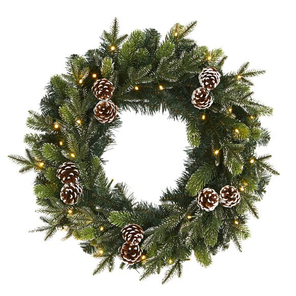 24" Snowed Pinecone Xmas Wreath with 35 Clear LED Lights