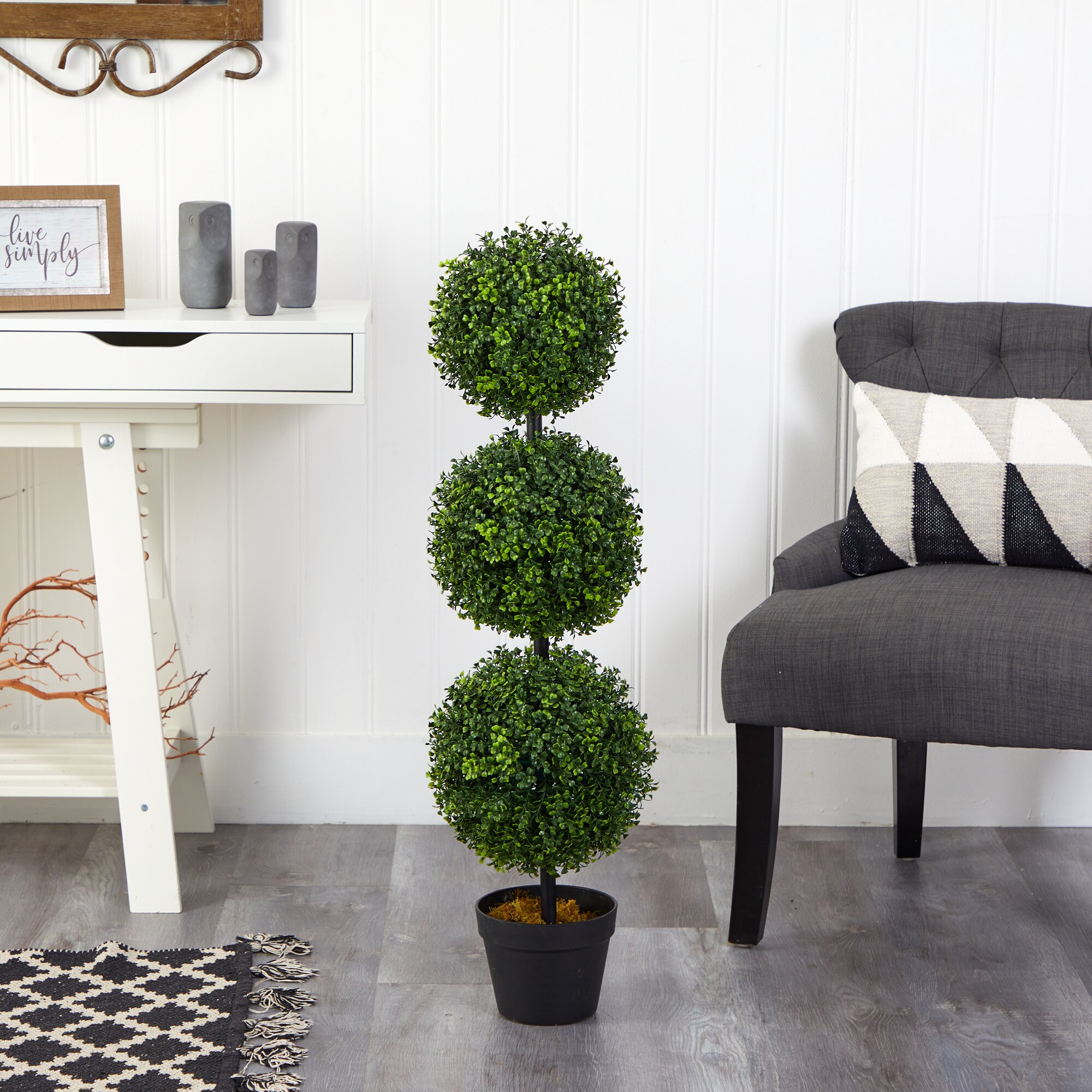 Elegantly greet guests with this triple boxwood topiary. Three perfectly trimmed boxwood balls sit in synergy and are made of realistic-looking boxwood foliage. You can now enjoy the sophistication of the boxwood without maintenance or care. Standing 3' from a black nursery planter (included in height), curate in compact spaces. Perfect for an apartment, bathroom, room corner, or foyer.