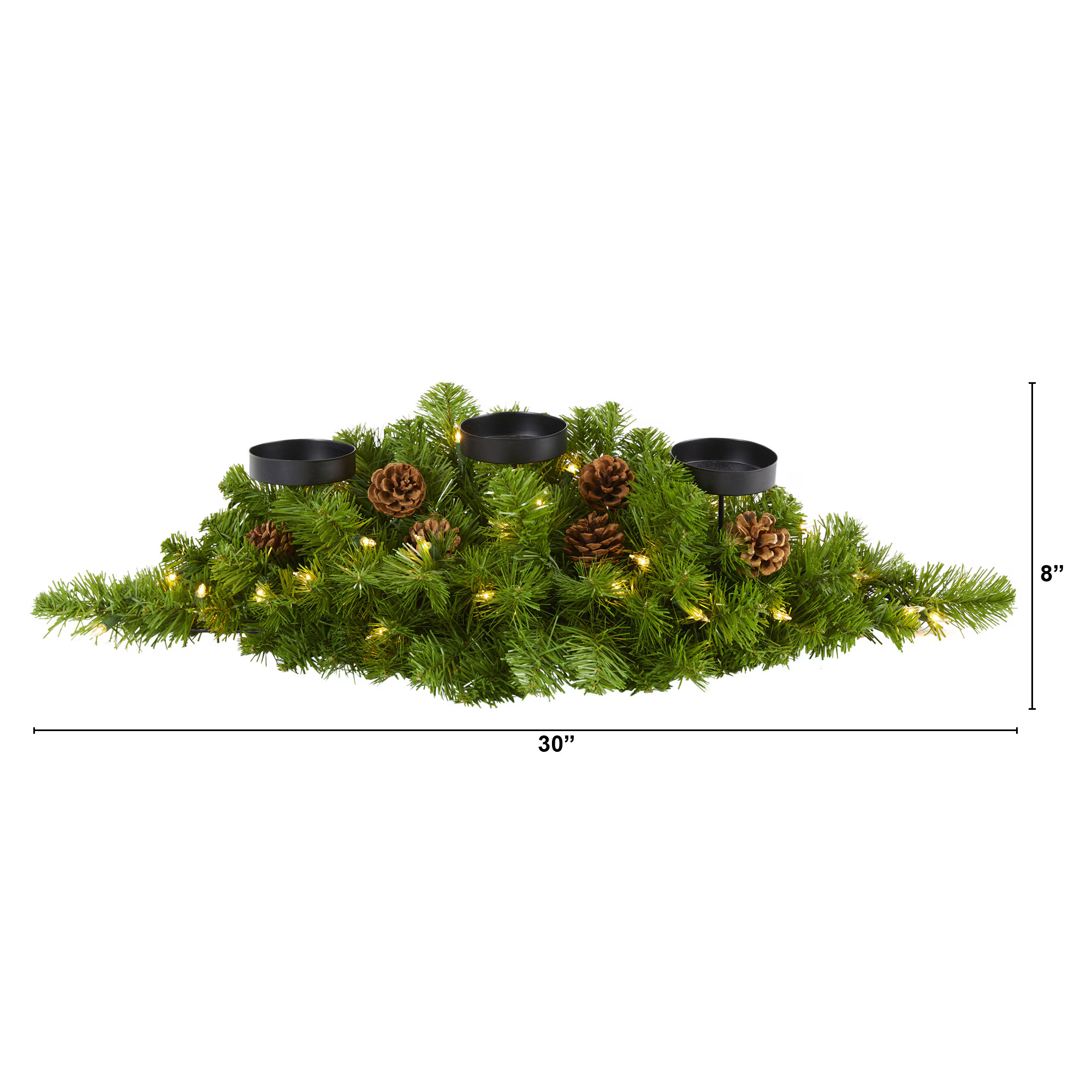 Set your home aglow this holiday season with the help of this artificial candelabrum; specifically designed as an elaborate candle holder, it's intricately designed from a rich overgrowth of realistic looking pine greenery, handsomely accented with miniature faux pinecones, all carefully surrounding a trio of candle holders. Better yet, this seasonal centerpiece comes already pre-strung with 35 clear lights, eliminating pre-tangled messes and holiday stress. Reaching 30 inches long, this winter-ready decorative accent would make an enchanting addition to a mantle or a holiday-inspired tablescape.
