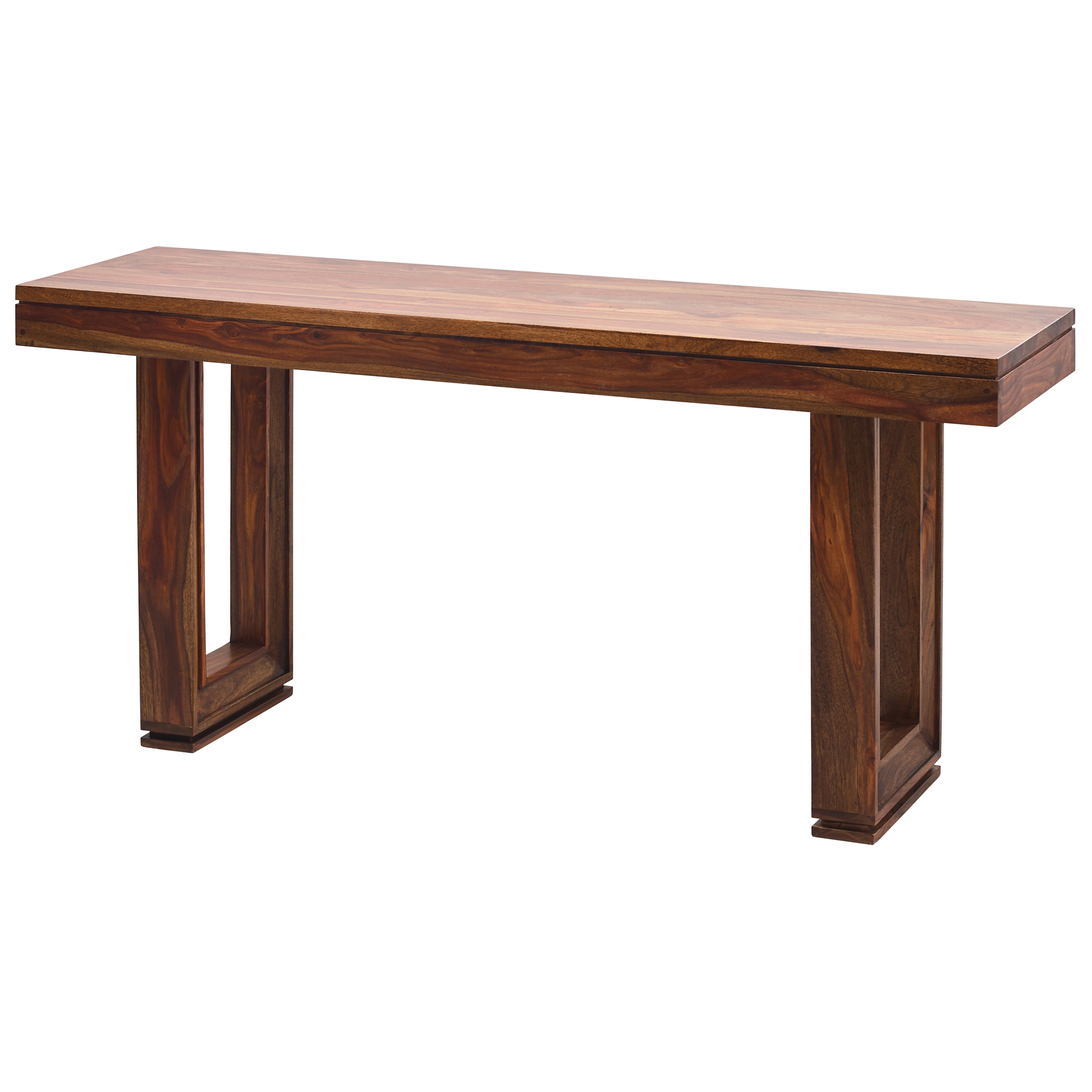 The Cinnamon Amber Console Table 66 Inch Solid Sheesham Wood Hand Made. This stylish clean Console offers a modern organic design with its subtle modern angles and linear lines defining the substantial solid wood planks. Customers often choose this Collection for its spectacular finish affects achieved in the special Sheesham, wood used, also known as rosewood or palisander, a sustainable tropical hardwood, famous for its rich grain and hardness. The console features a warm Amber Cinnamon natural Stain finish. The finish offers a warm color that brings out the contrasting beauty in the exotic Sheesham wood grain. The Cinnamon Amber group is constructed, using tongue and groove joint methods. The Console is part of The Cinnamon Amber Collection and can be combined for a larger affect by adding the Table, chairs, sideboard, credenza and even the matching cocktail and occasional set. Hand Made in India for AFD Home. Minor Assembly Required!