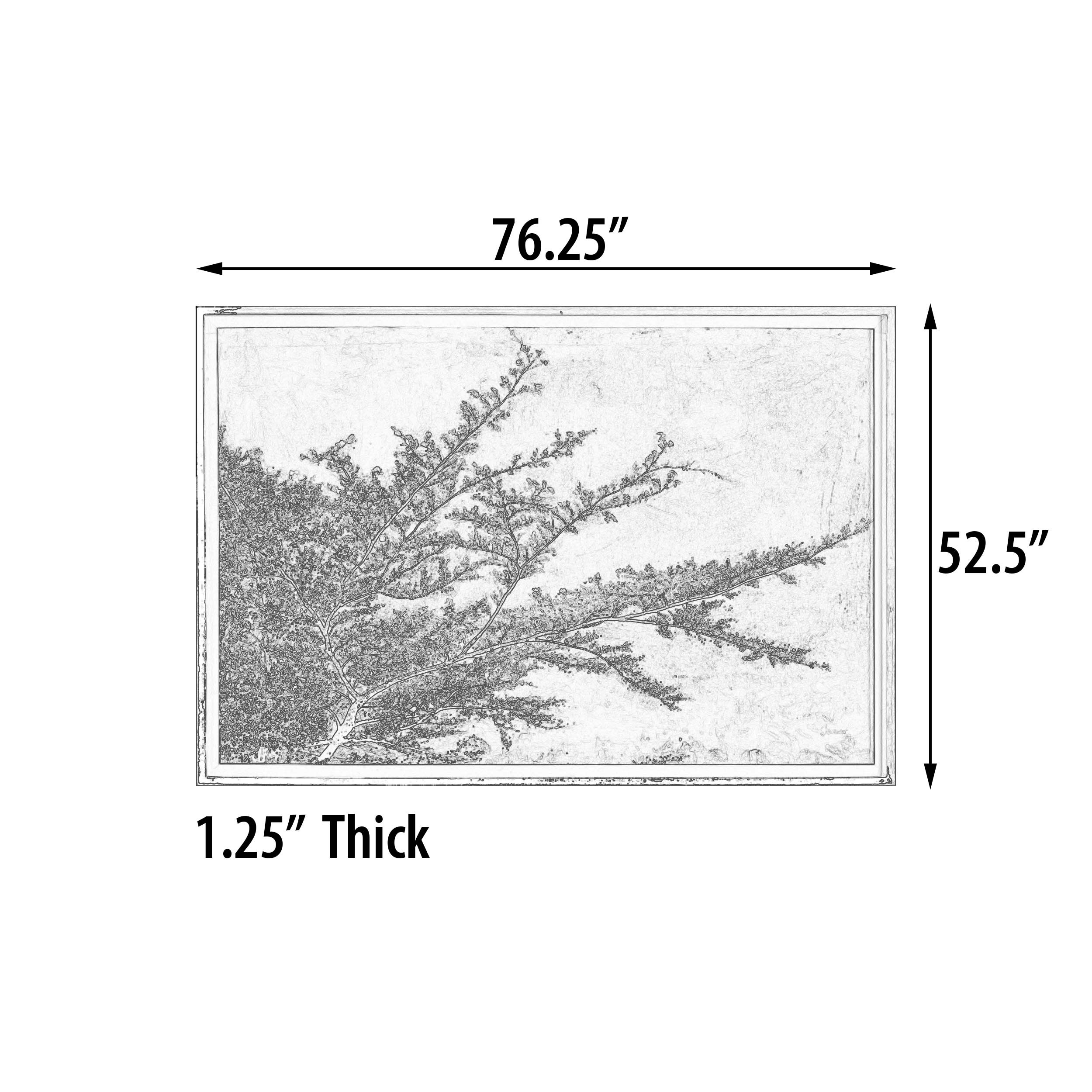 This oversized hand-embellished wall art, made in the USA, measures 75 inches wide by 54 inches high and brings the beauty of nature into your home. The artwork captures the delicate elegance of blooming branches against a warm, ethereal backdrop. Soft white blossoms and tender red buds stretch gracefully across the canvas, set against a dreamy gradient sky of golden yellows, gentle purples, and sunset oranges. The textured, hand-applied accents create depth and dimension, allowing the artwork to change subtly as light plays across its surface. Encased in a sleek wooden frame, this piece offers a harmonious balance between contemporary style and natural inspiration, making it perfect for living rooms, dining spaces, or grand entryways. Its oversized scale ensures it will be the focal point of any room, adding warmth, sophistication, and artistic elegance to your décor.