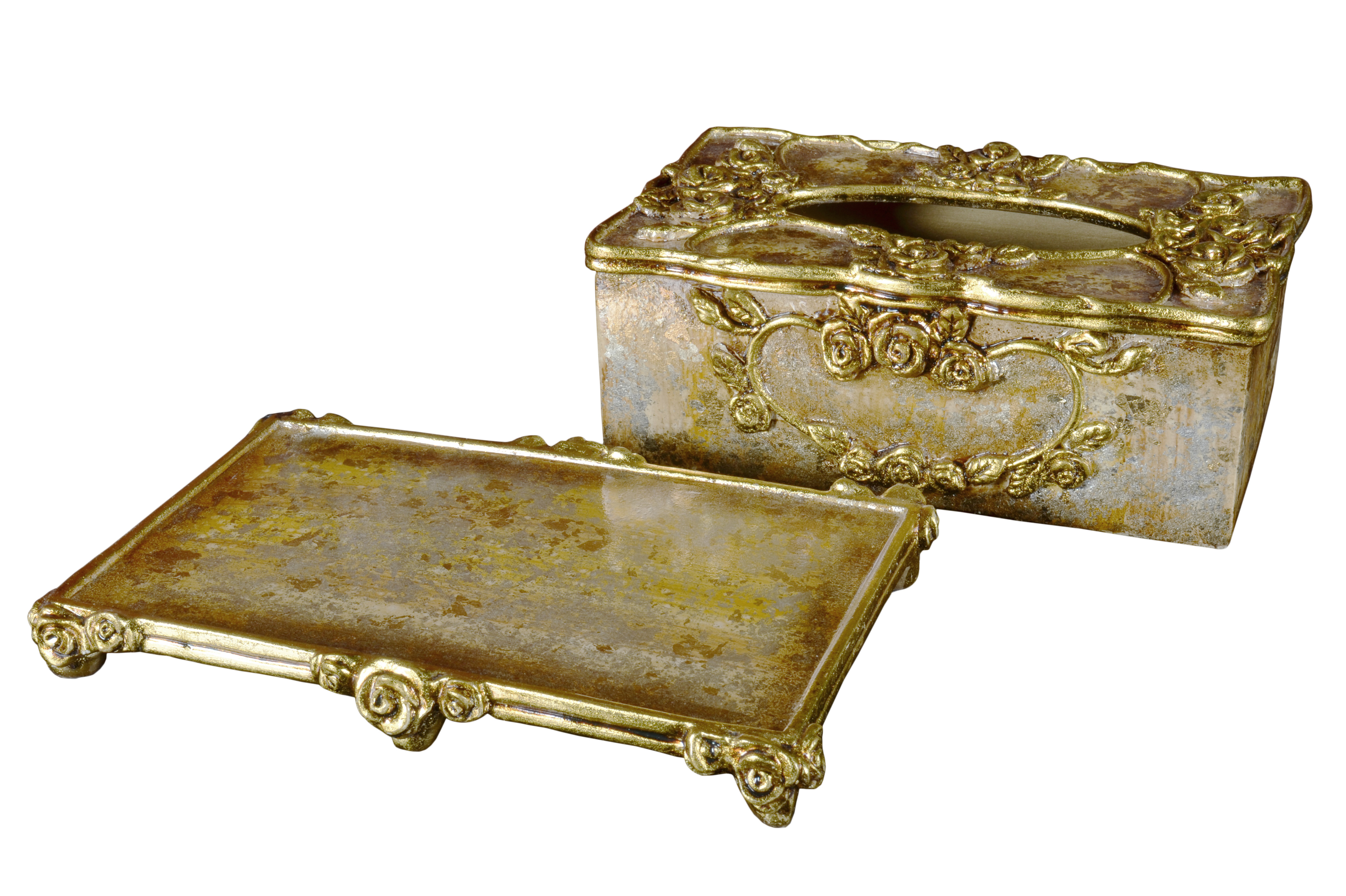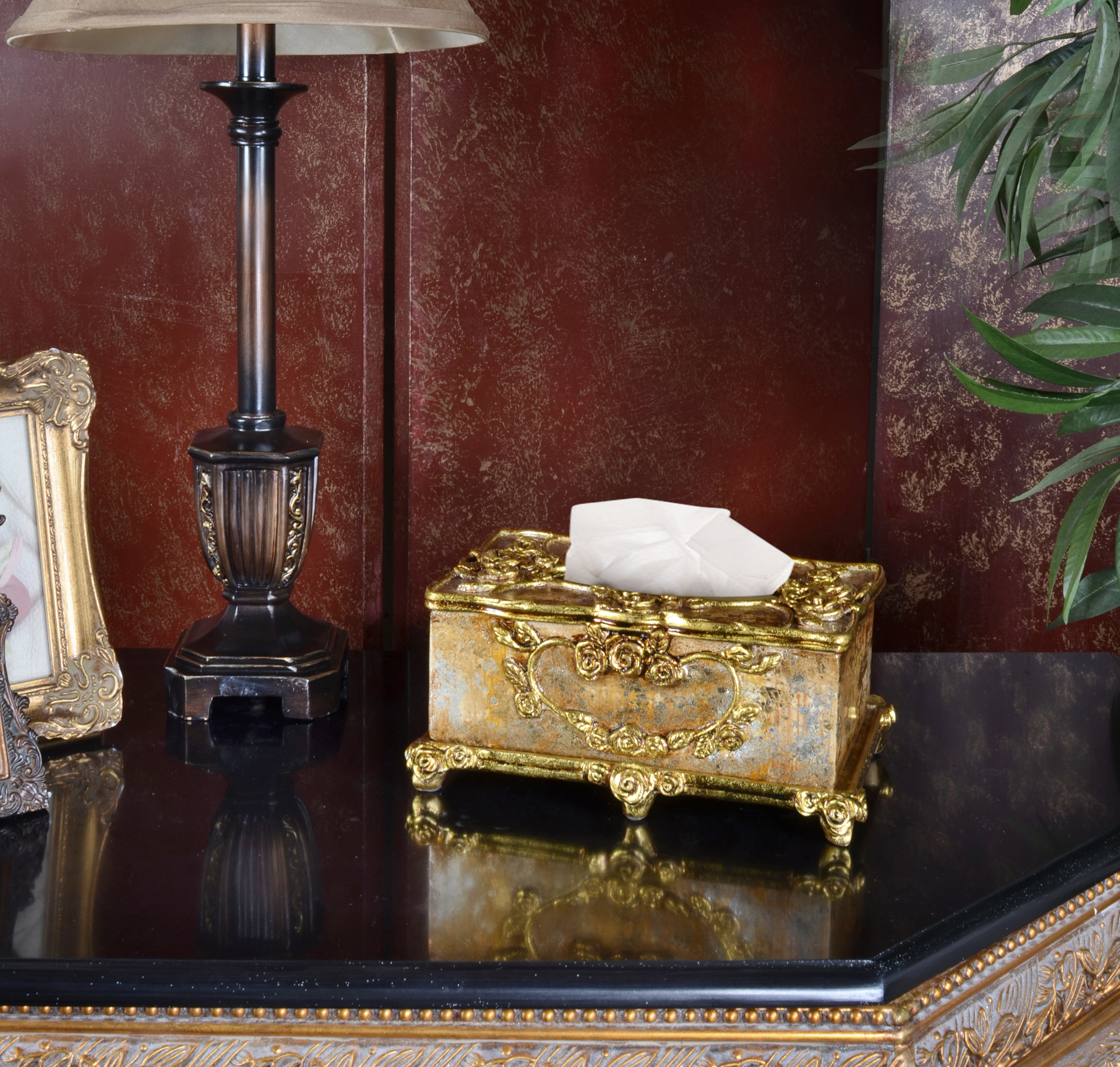 The Medici Elegant Tissue Box 10.8 inches wide x 6.69 inches deep x 4.92 inches tall is a decorative and functional Tissue Holder. This item adds beauty and function and is a good choice for a ladies desk or dresser. From the House of Medici collection, a collection inspired by the art of Florence and the old world opulence of the Italian Renaissance Era. Hand cast in durable Polyresin. Intricate raised details are accented and antiqued with rich jeweled tone hand finishing. The subtle use of real variegated gold and silver leafing is a special effect of this extraordinary Medici Collection. Consider adding this item with other offerings from the Fabulous Medici Collection for an even larger grouping. No Assembly Required.