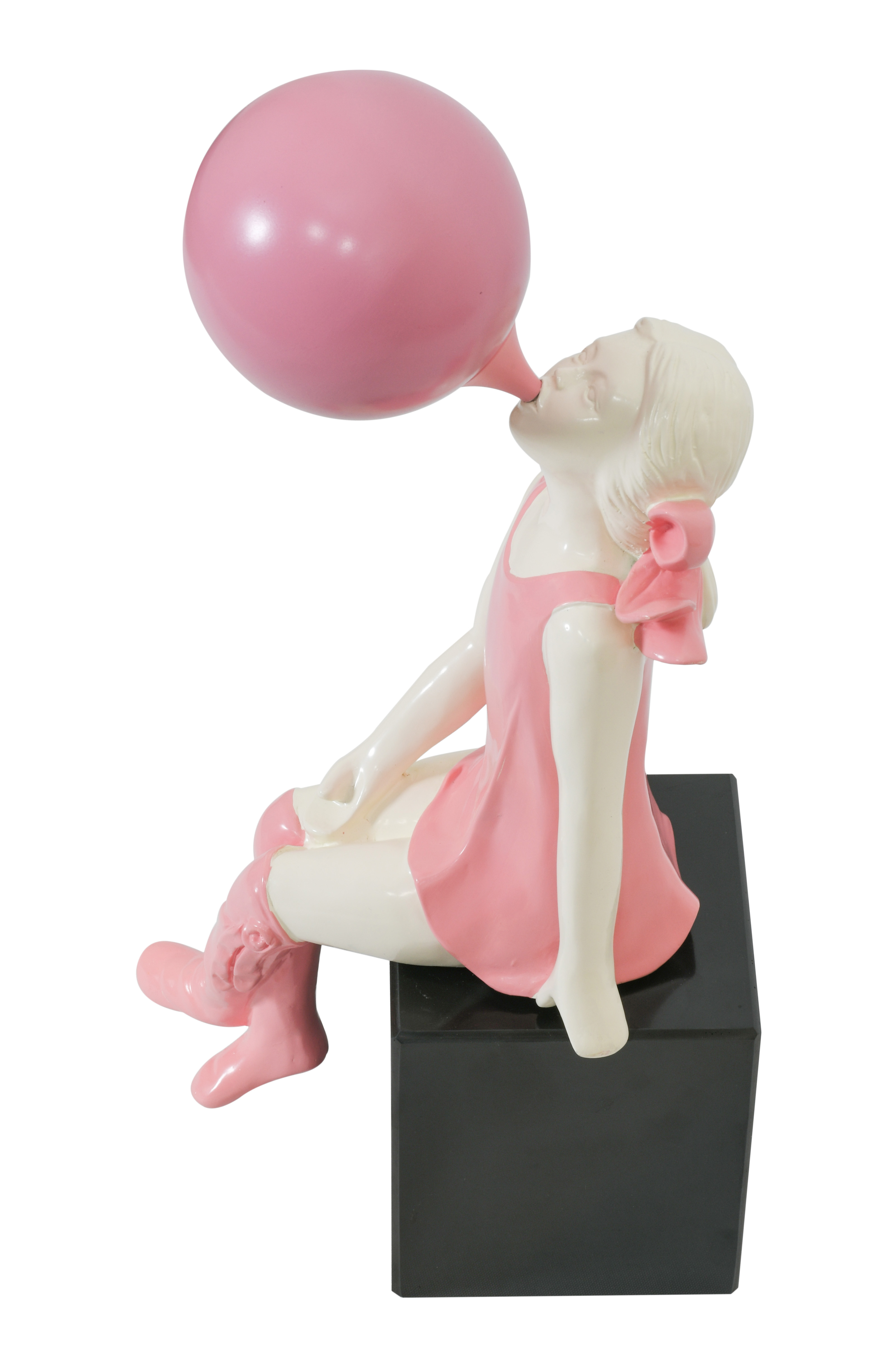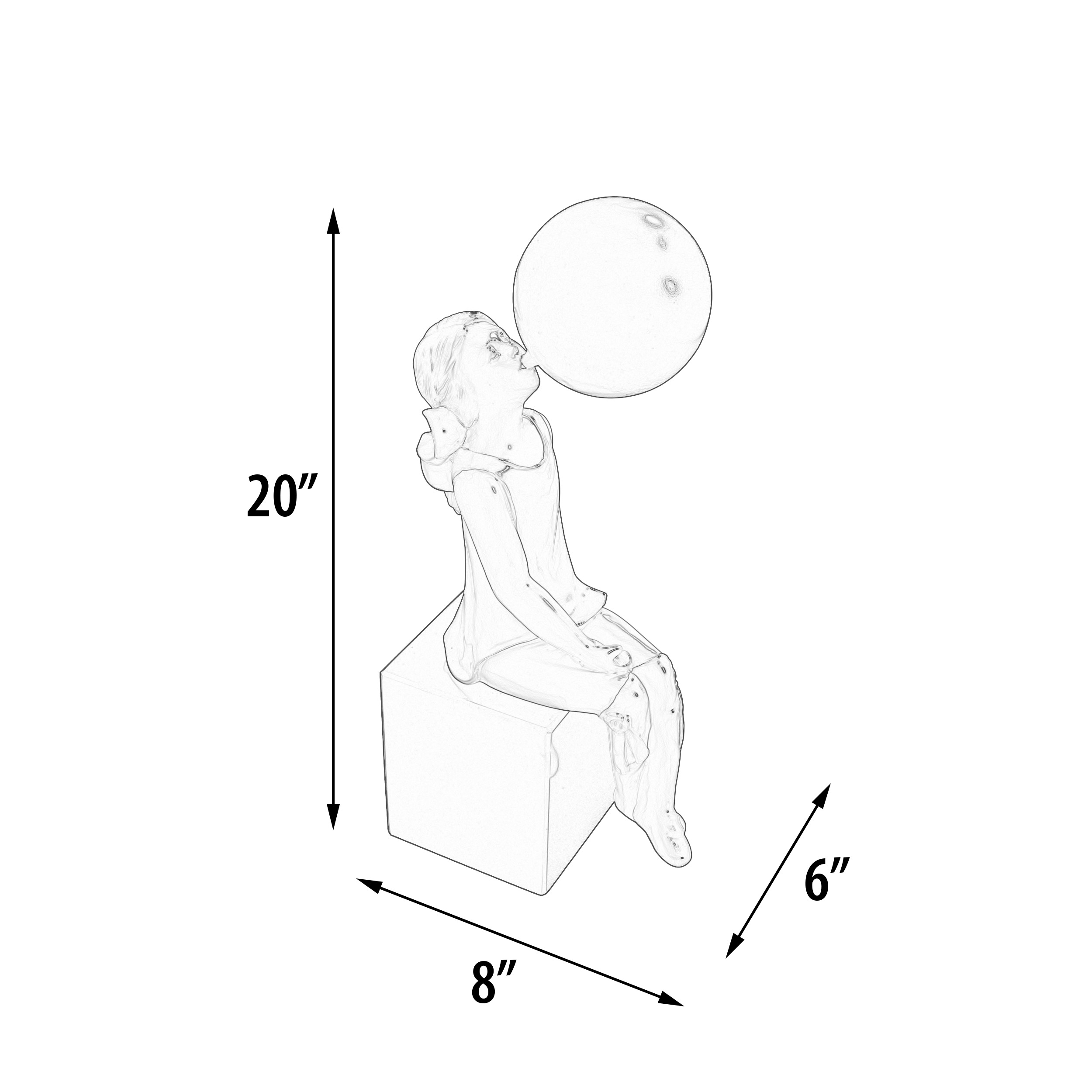 Bubblegum Girl is a chic 20-inch decorative sculpture. This pop art-inspired piece features a girl seated on a pedestal; her head slightly tilted up as she blows a bubble with bubblegum. Perfect for tabletops or shelves, it adds a contemporary touch and a hint of whimsy to your decor.