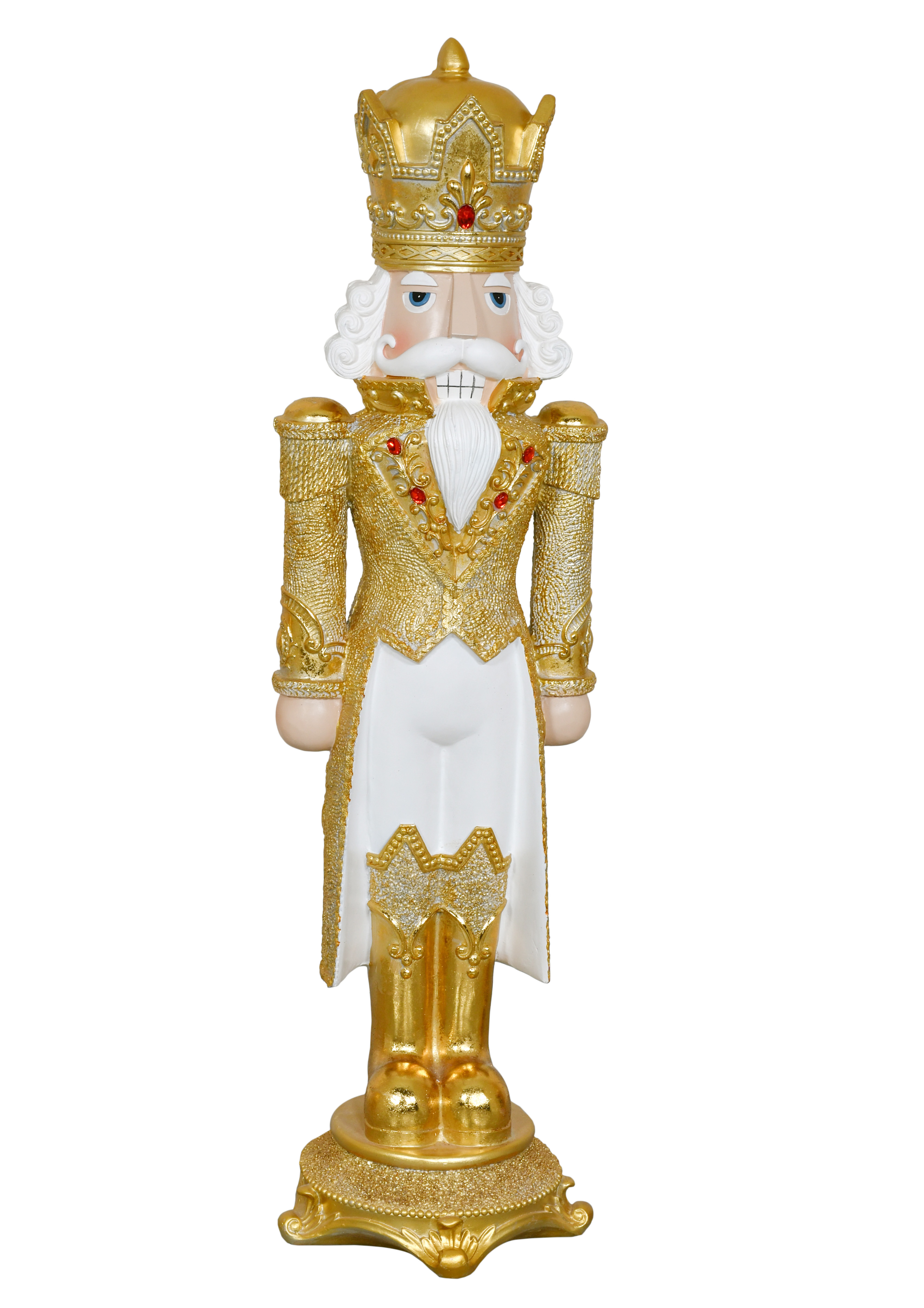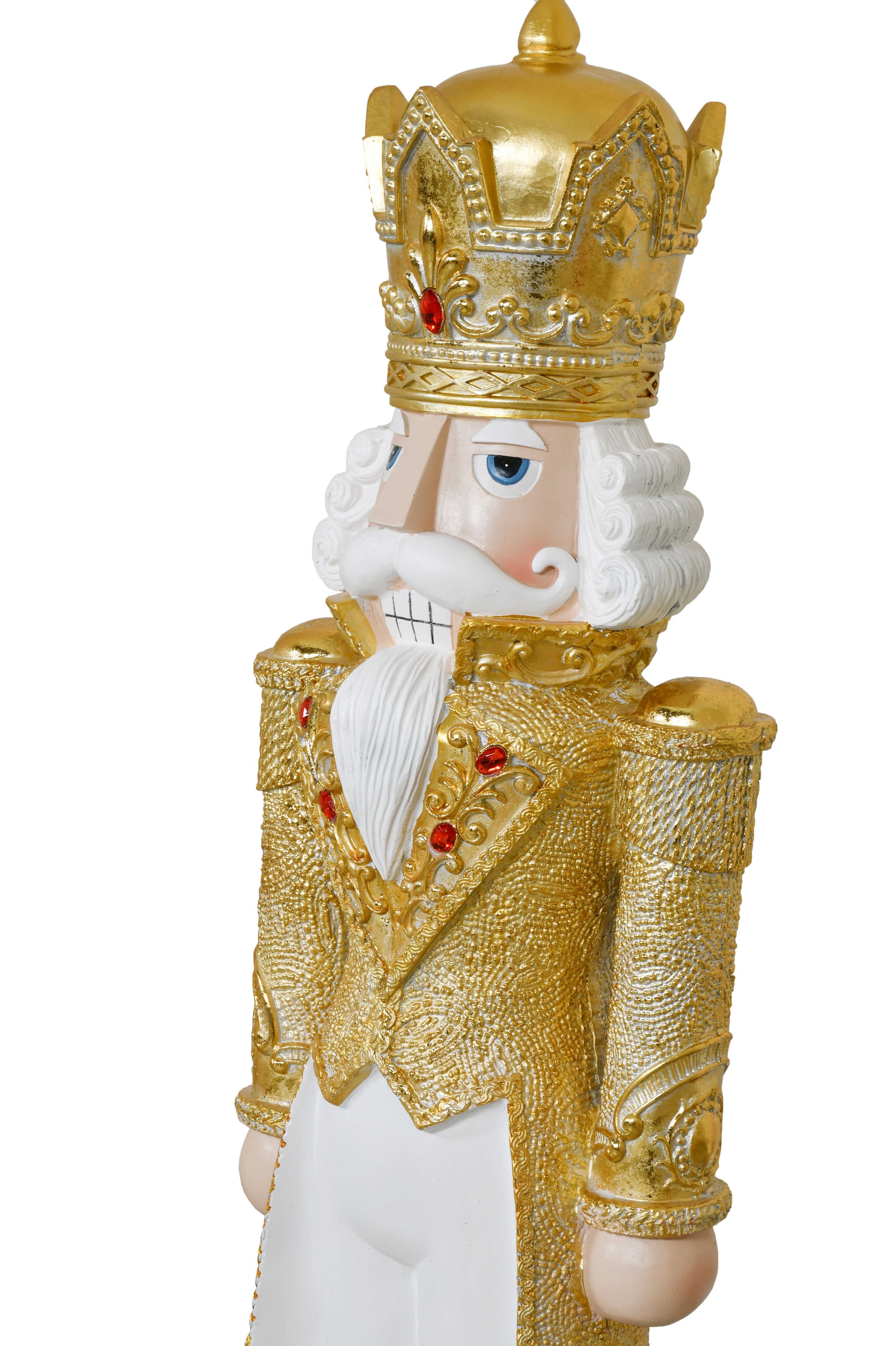 This majestic 36-inch nutcracker figurine is a resplendent statement piece, clad in gleaming gold regalia. His royal attire is meticulously detailed, from the gilded buttons lining his coat to the crown perched atop his wise, white-haired head. Standing on a matching pedestal, this nutcracker embodies the opulence and grandeur of a bygone era, bringing an air of nobility and splendor to any space it graces. With its impressive height and commanding presence, this piece is not just a holiday decoration but a year-round symbol of elegance and authority, perfect for adorning a stately room or serving as the centerpiece of a festive display.