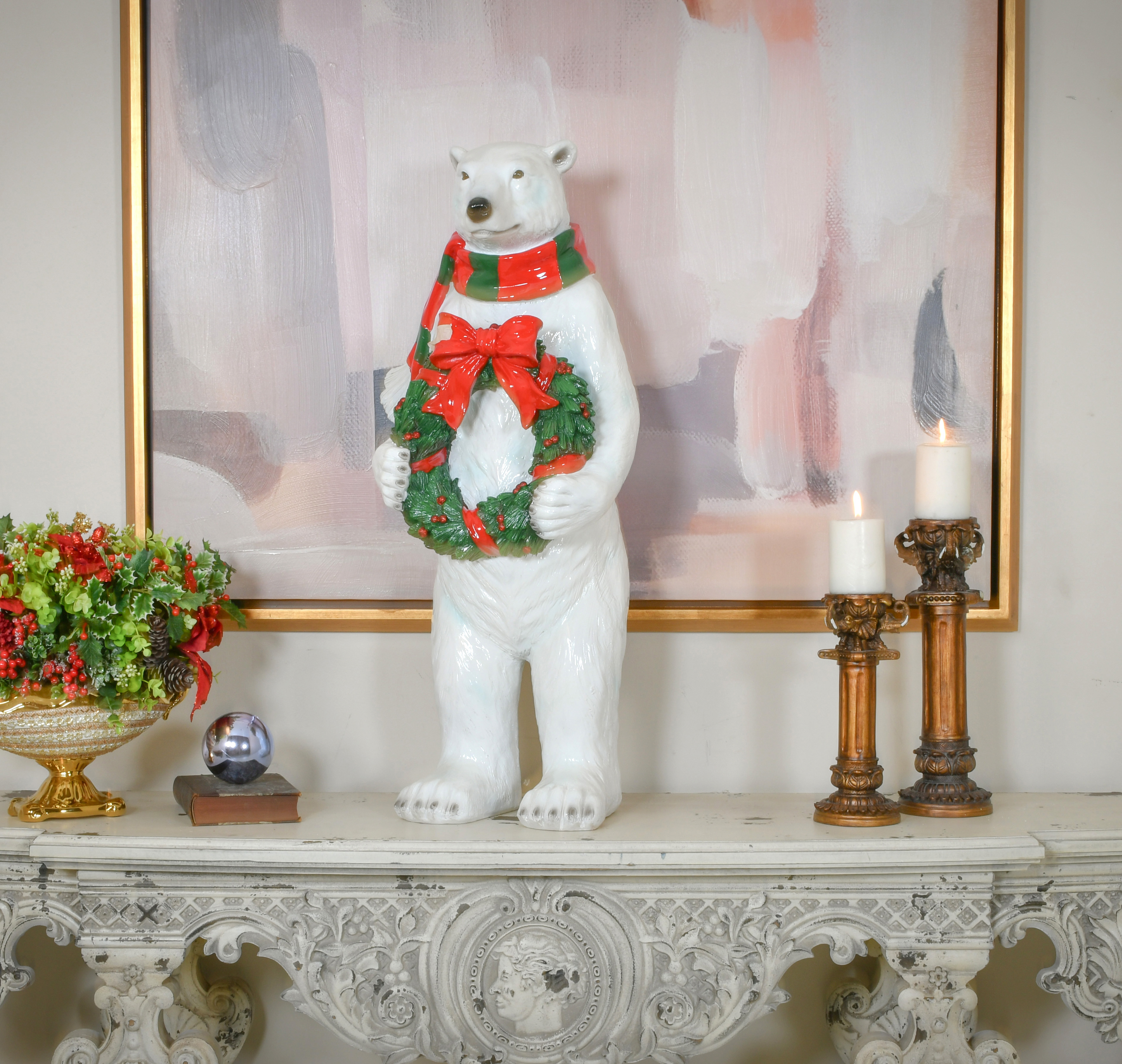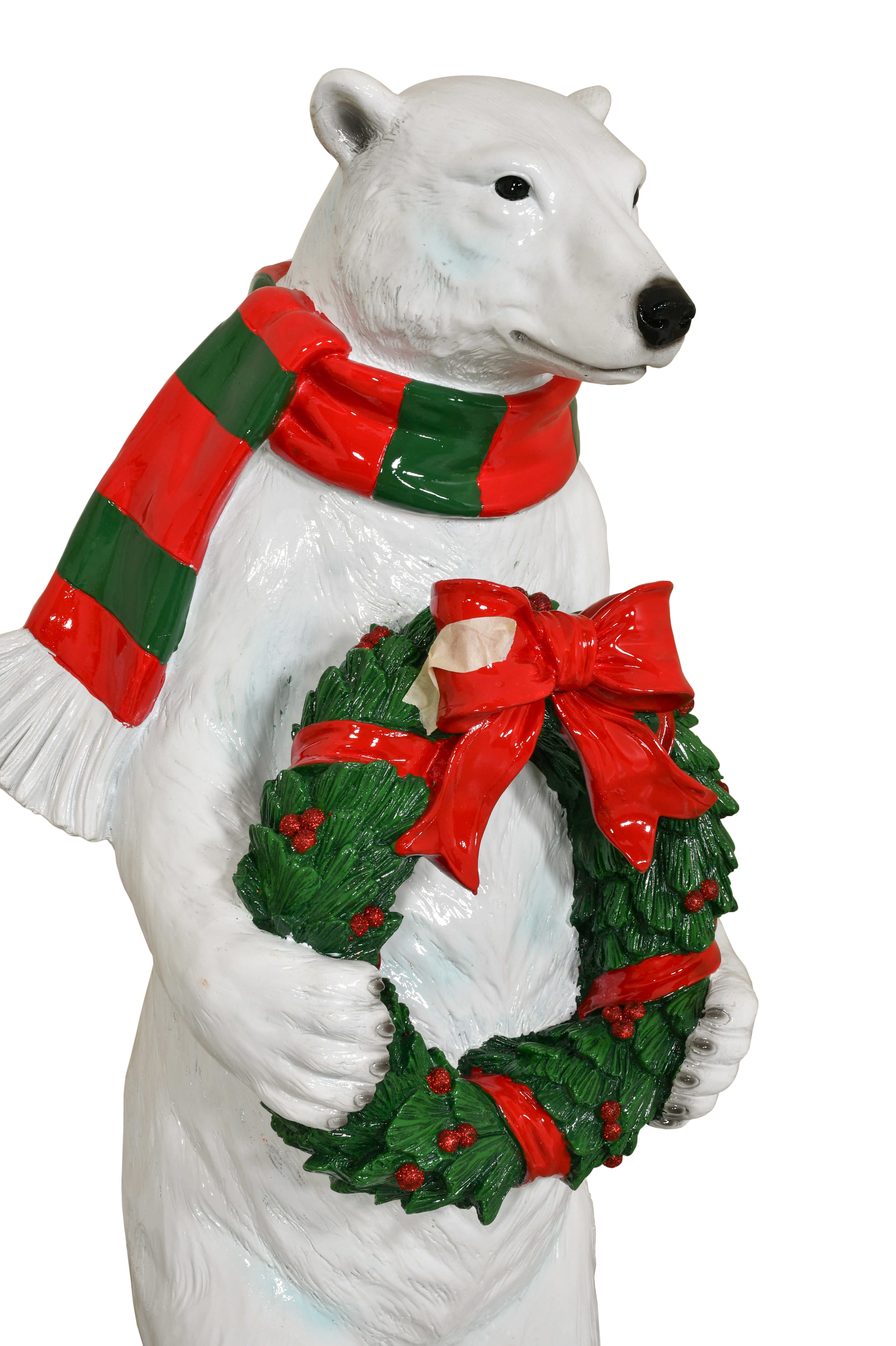This charming 36.5-inch-high polar bear statue, donning a vibrant red and green scarf, holds a festive wreath, welcoming the joyful spirit of the season. This endearing figure captures the essence of winter's wonder, with its meticulously sculpted fur and friendly demeanor adding warmth to any holiday decor. Whether placed by a roaring fireplace, in a snowy window display, or greeting guests in a cozy entryway, this delightful polar bear is an inviting addition to your seasonal ensemble, promising to spread cheer and a touch of playfulness to your winter celebrations.