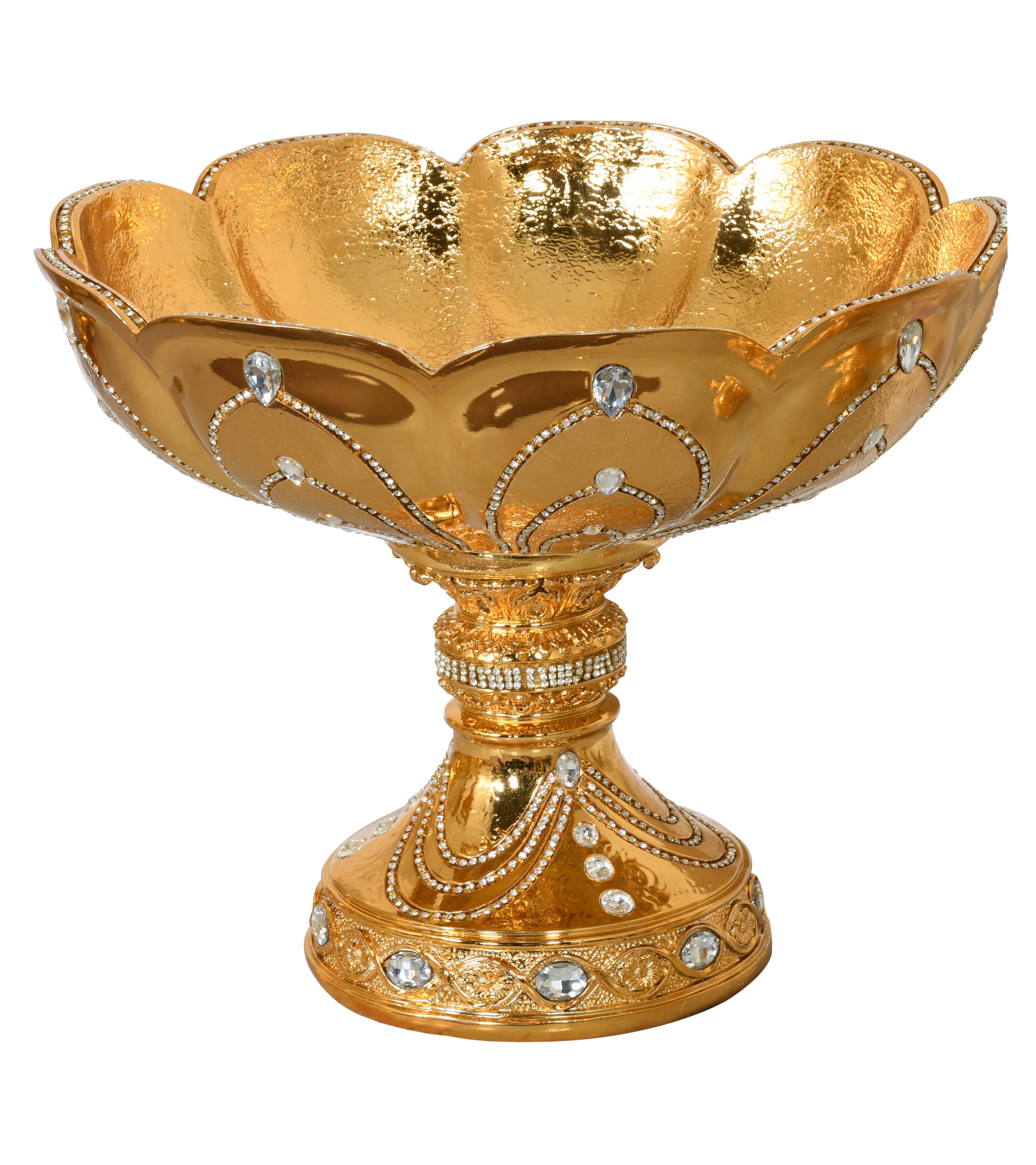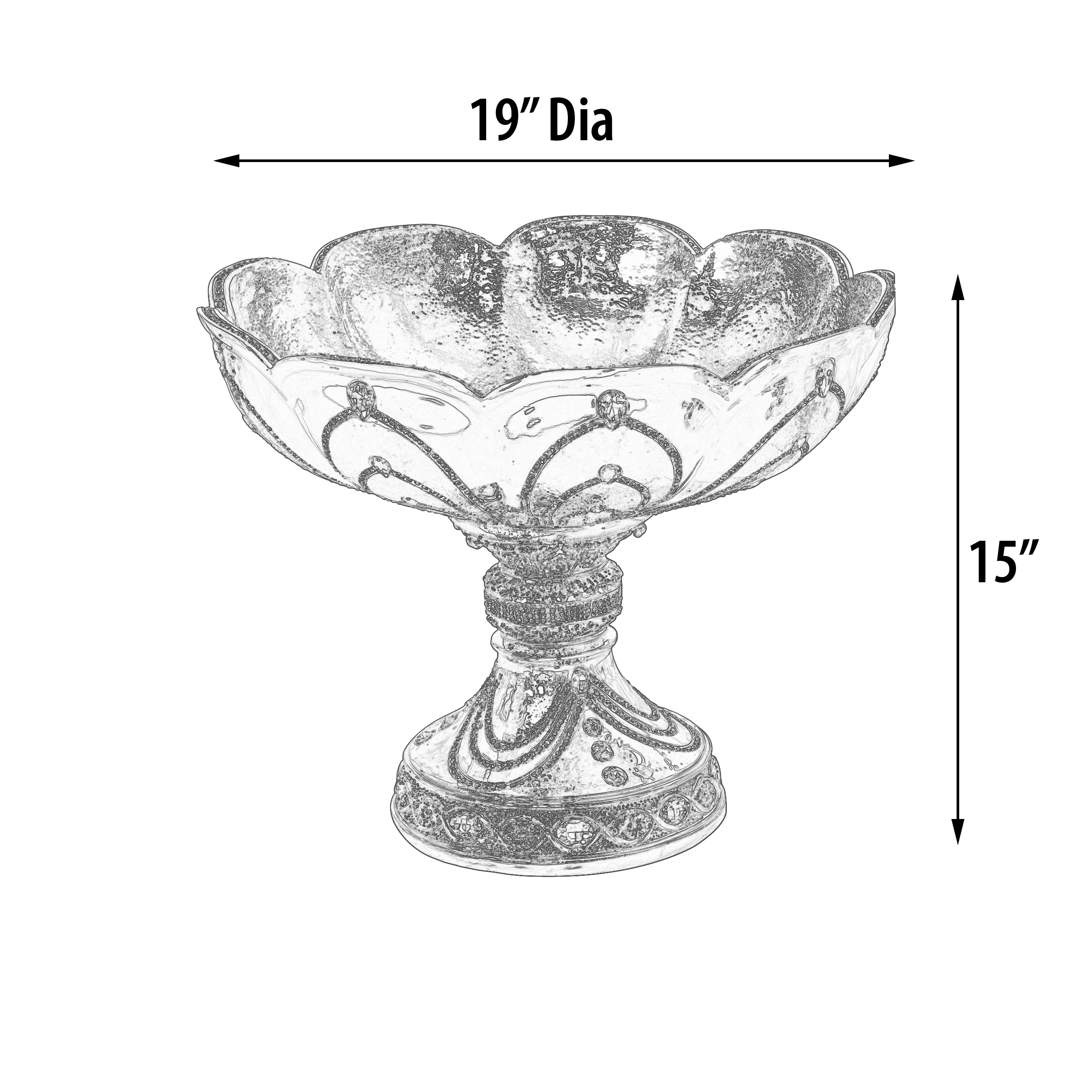 Embrace the European Elegance Grand Golden Pedestal Bowl a captivating centerpiece exuding opulence. Its grand design commands attention, accentuated with rhinestone crystals set in a beautiful swag pattern. This striking bowl becomes a stunning focal point in any setting, perfect for showcasing floral arrangements or decorative accents. Elevate your decor with the allure of European elegance through this luxurious and timeless showpiece.